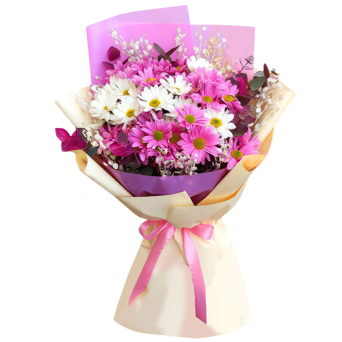 Нежное сочетание розовых и белых оттенков хризантем создает атмосферу радости и легкости. Букет состоит из розовых и белых кустовых хризантем, эвкалипта и лунарии. Упакован в розовую и кремовую матовую плёнку, украшен розовой атласной лентой. Эта композиция наполняет пространство уютом и свежестью. Подойдет для встречи из поездки для любимой женщины.