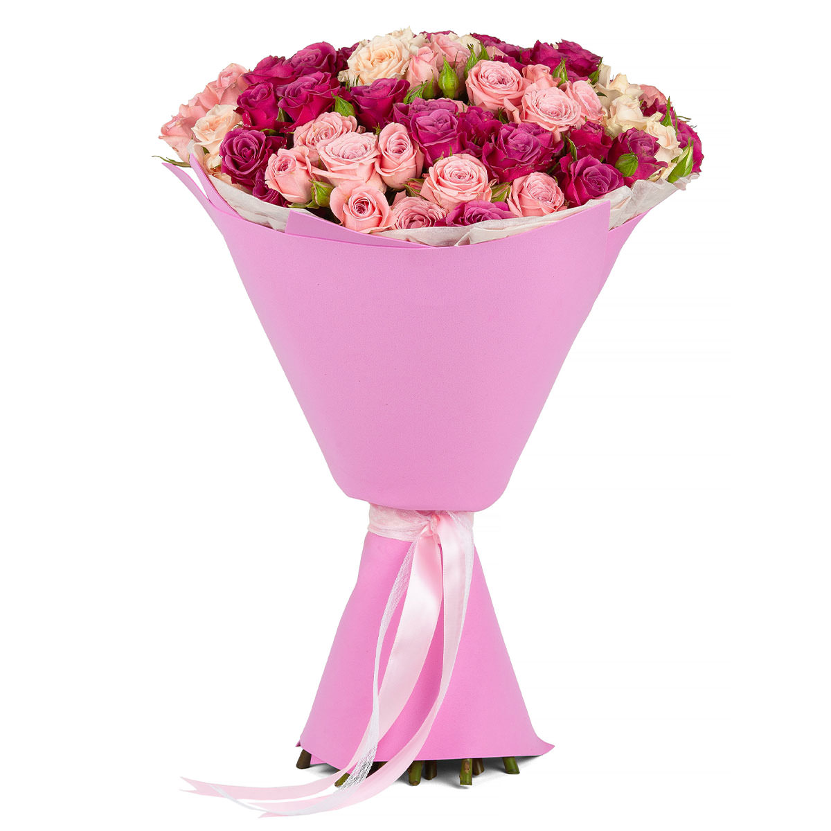 Восхитительная палитра розовых и сиреневых оттенков вызывает нежные эмоции. В составе: роза кустовая розовая и сиреневая. Букет оформлен в розовую матовую пленку и украшен атласной лентой, что придаёт ему элегантность. Этот букет создаёт атмосферу романтики и подходит на помолвку для невесты.