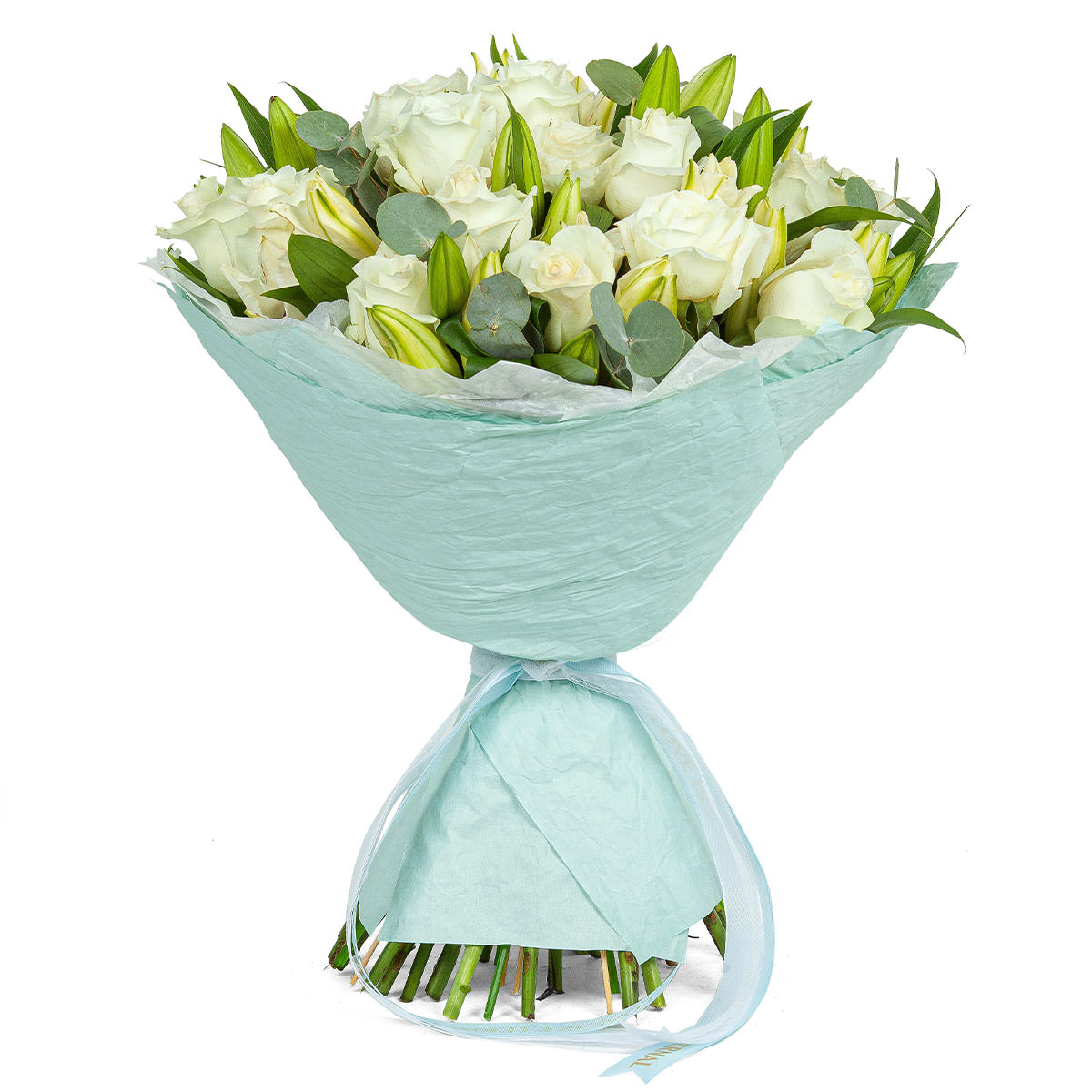Этот букет в бело-зелёной гамме вызывает ощущение свежести и гармонии. В его составе белые одноголовые розы, белые лилии и эвкалипт. Упакован в светло-голубую бумагу с атласной лентой, создавая элегантный вид. Композиция приносит атмосферу утончённости и подходит для поздравления учительницы на День знаний.