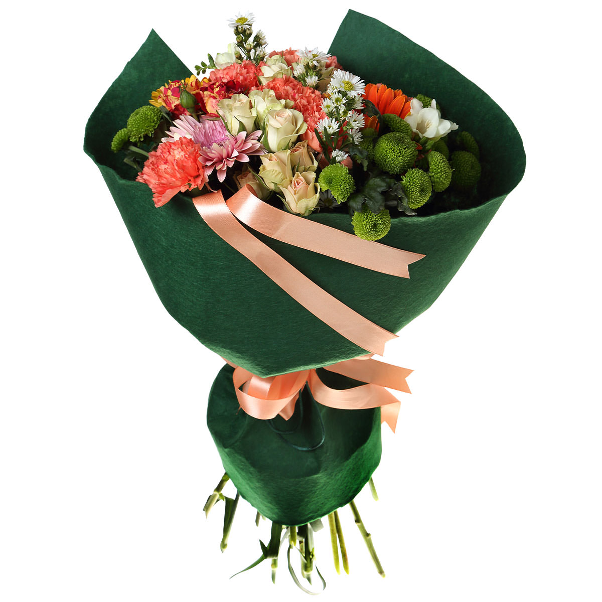 Яркое сочетание кремовых роз, оранжевых и зелёных хризантем, белоснежных фрезий, оранжевых гербер и нежных ромашек создаёт атмосферу радости и тепла. Букет оформлен в изысканную зелёную упаковку с атласной лентой персикового оттенка. Эта композиция идеально подойдёт для праздничного настроения на свадьбе. Прекрасный подарок для молодой мамы.