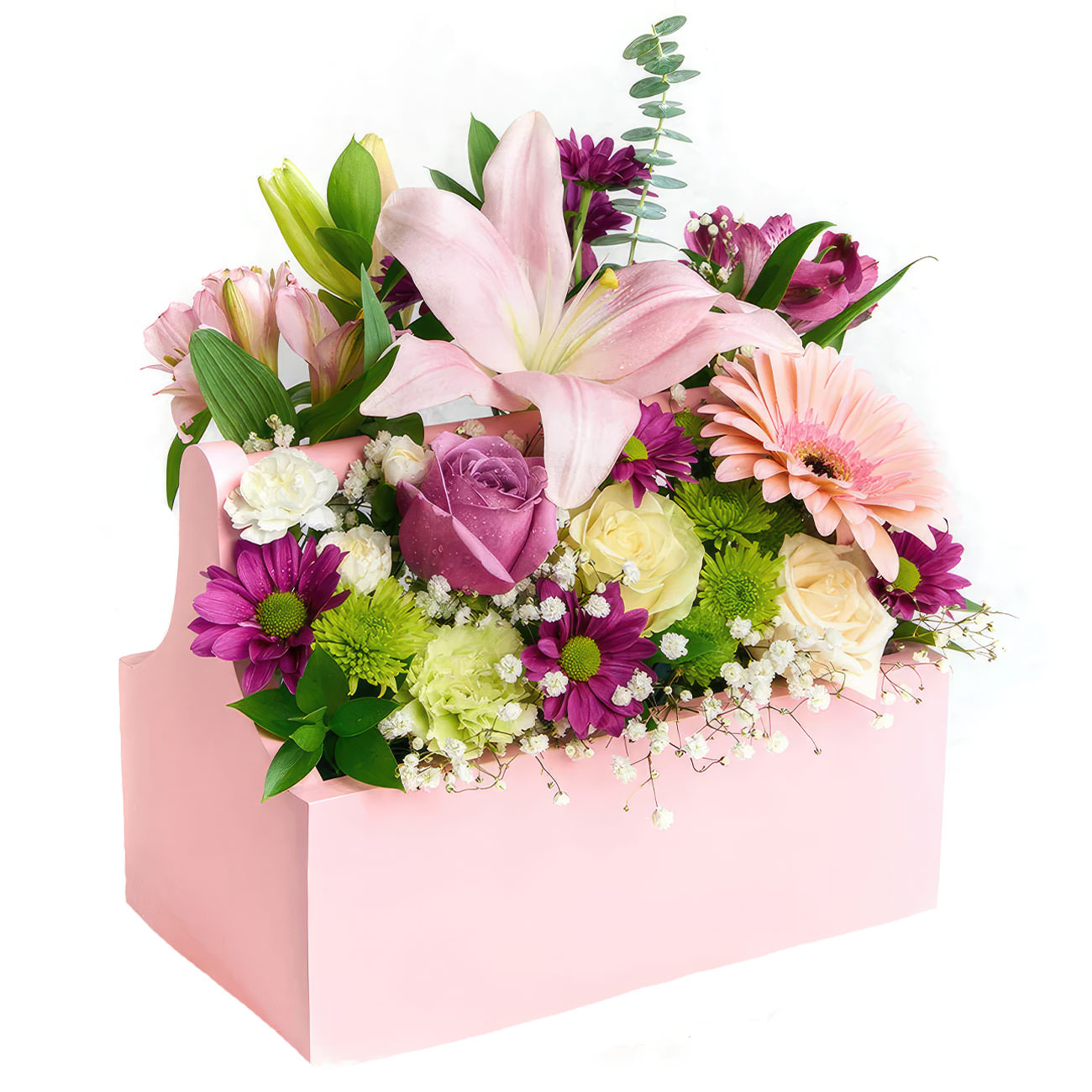 Эта нежная композиция из розовых лилий, гербер и сиреневых роз создаёт атмосферу лёгкости и романтики. В составе также присутствуют кустовые хризантемы зелёного и сиреневого оттенков, белый диантус, сиреневая альстромерия, гипсофила и эвкалипт. Все цветы аккуратно расположены в изящном розовом ящике с оазисом. Эта композиция станет прекрасным подарком для подруги на юбилей.