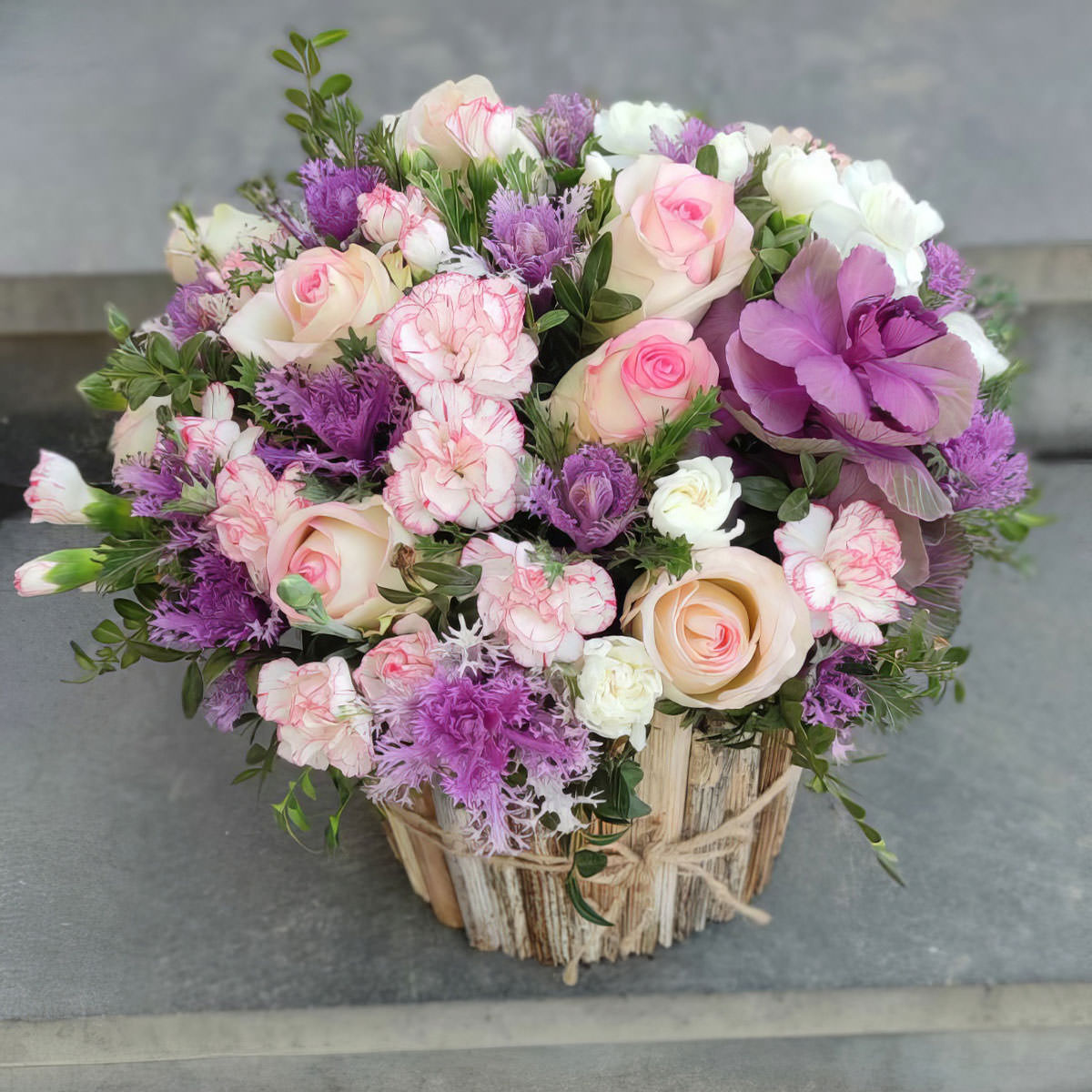 Эта композиция из розовых и фиолетовых оттенков создаёт атмосферу нежности и гармонии. В состав входят розовые одноголовые розы, декоративная капуста, розовые гвоздики и фисташка. Композиция оформлена в деревянной корзине, добавляющей природное очарование. Подходит для поздравления любимой на День Святого Валентина.
