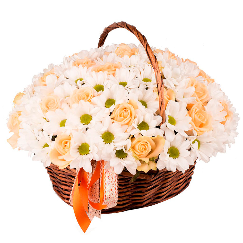 Корзинка с хризантемами и розами «Нежная элегия» с гарантией качества, цены и быстрой доставки!