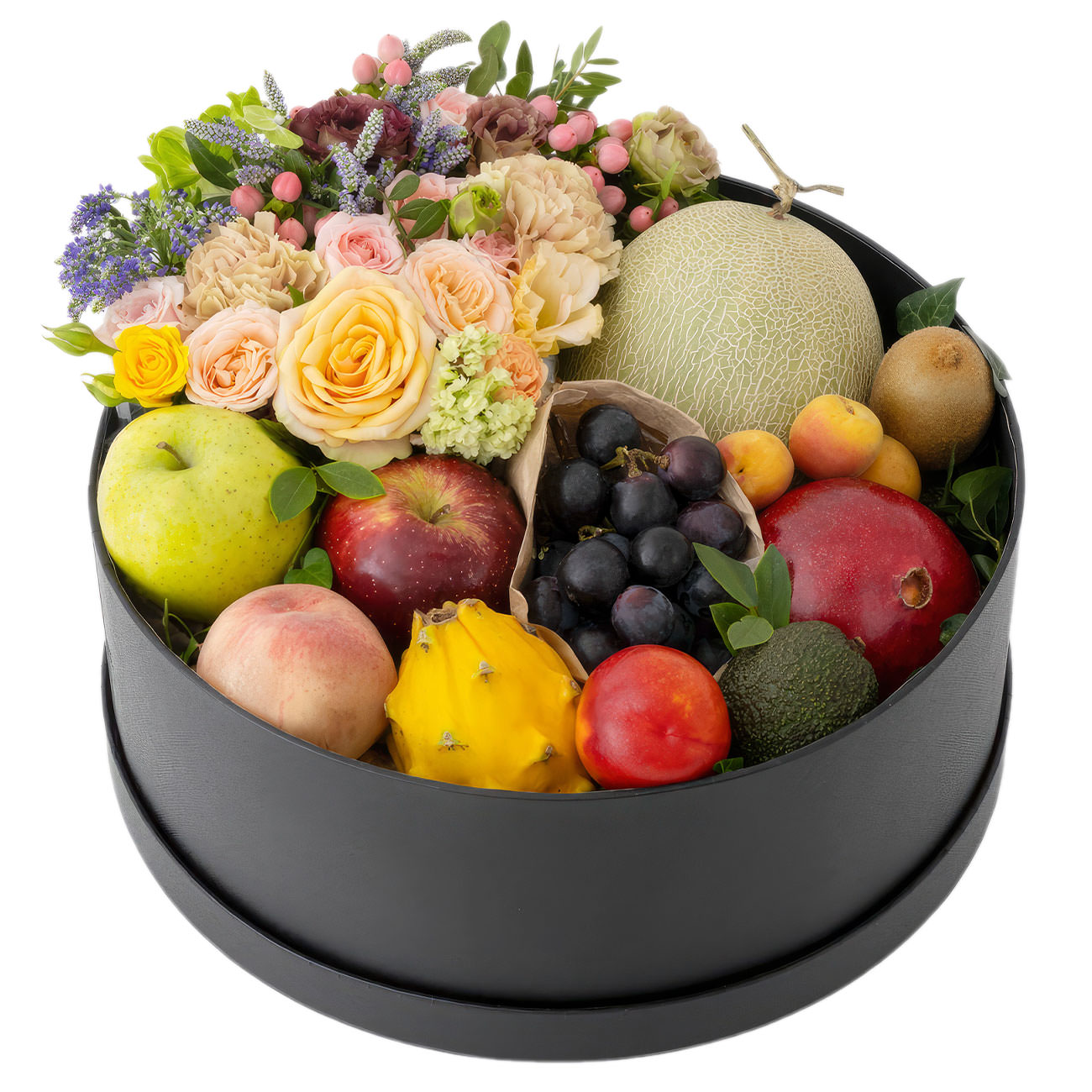 Шляпная коробка с цветами и фруктами «Праздничная феерия» с гарантией качества, цены и быстрой доставки!