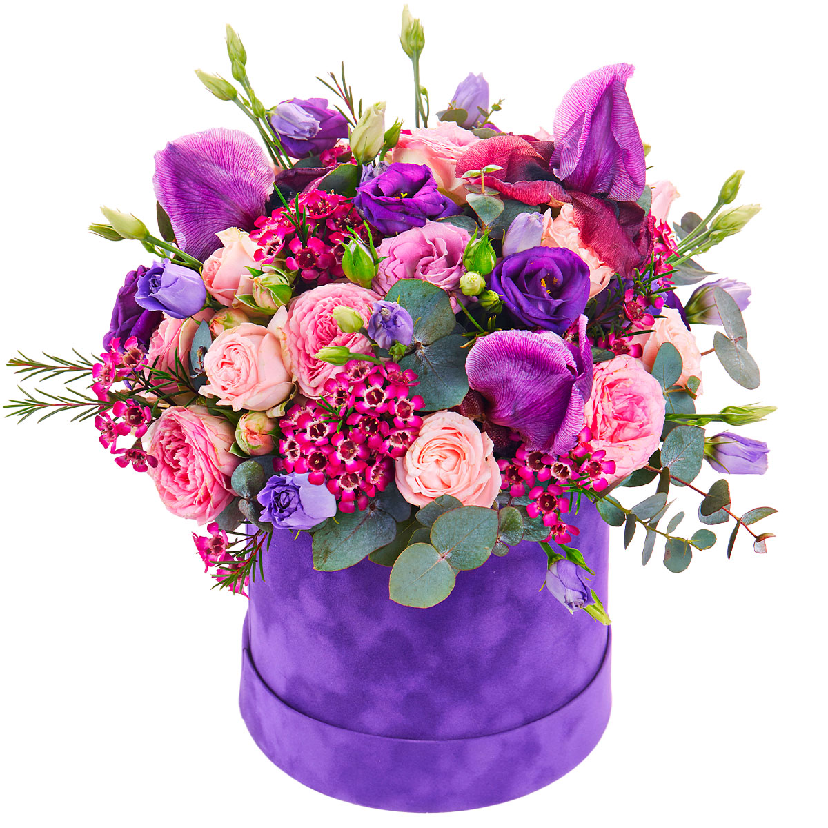 Эта композиция поражает яркостью сиренево-фиолетовой гаммы, создавая атмосферу романтики и нежности. В составе пионовидные розовые розы, фиолетовые эустомы, фиолетовые ирисы, сиреневый ваксфлауэр и эвкалипт. Упаковано в элегантную бархатную шляпную коробку фиолетового цвета. Это идеальный подарок для невесты на помолвку, создающий атмосферу волшебства.
