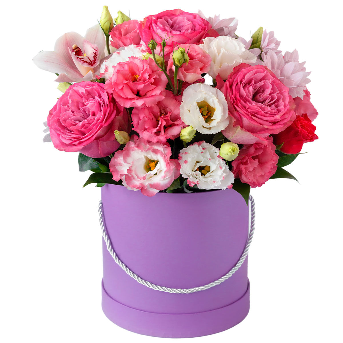 Эта композиция очаровывает нежными розовыми и белыми оттенками. В составе пионовидная розовая роза, белая и розовая эустома, кустовая красная роза, розовая орхидея и нежно розовая кустовая хризантема. Все цветы аккуратно размещены в стильной шляпной коробке фиолетового цвета с белой веревочной ручкой. Такой букет создаёт атмосферу романтики и утонченности. Отлично подойдет на свидание для любимой женщины.
