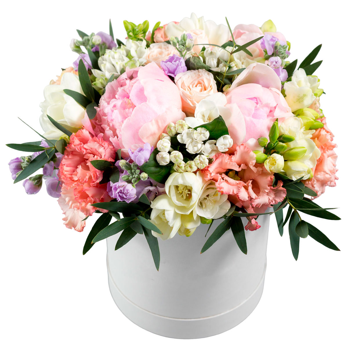 Яркие и нежные оттенки розового и белого создают атмосферу лёгкости и утончённости. В составе композиции пион розовый, эустома розовая, фрезия белая, маттиола лиловая, роза одноголовая нежно розовая и эвкалипт. Цветы оформлены в цилиндрической шляпной коробке белого цвета. Этот букет станет отличным подарком для любимой женщины на годовщину.